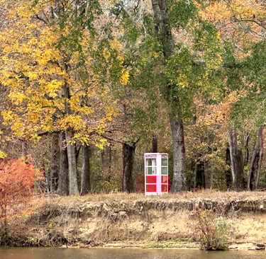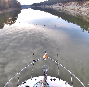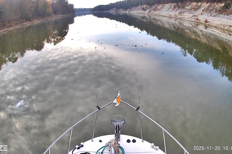Along the way, we saw a telephone booth placed on a bank by itself in the middle of nowhere. We are no longer on the Tennessee River having transitioned to the Tombigbee River. At one point we had 6 boats in our group. One fast boat charged ahead and the two slow boats were unable to keep up so they dropped off to find an anchorage. We have been traveling with the remaining two boats. Tonight, will be our first night anchoring on this section of the river and we hope to get through one more lock today. There has been a lot of wood in the river, a lot of it just under the water. We did hear a couple of thunk sounds on the hull, but have no vibration indicating damage. Well, we made it through the lock with an hour of sunlight to spare but had issues trying to set our anchor in a gravel bottom. We think it finally held, we will know tomorrow morning whether we have a wonderful night or not.
