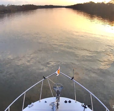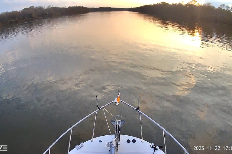 We got up at 5:30 am for a planned departure at 7. First light confirmed a thick fog with about a block of visibility settled around us. Our plan now is to delay departure until we have better visibility. We have a 54 mile run today to the last marina before Mobile with no locks to delay us. We have 266 miles yet to travel to get to Mobile, AL and the white sands of the Gulf of Mexico.