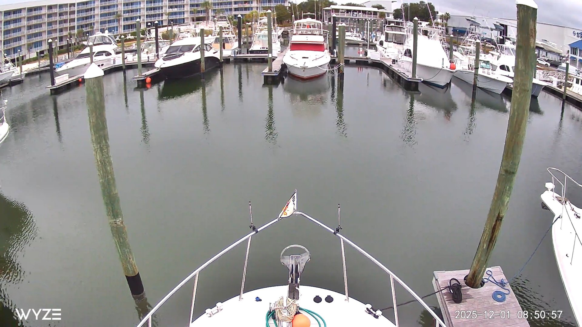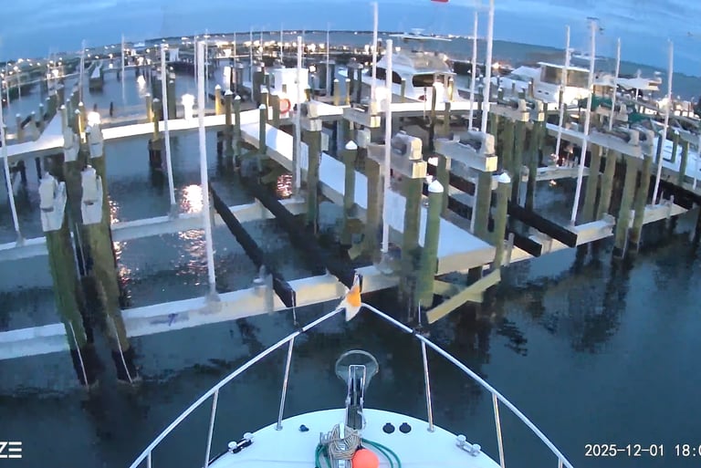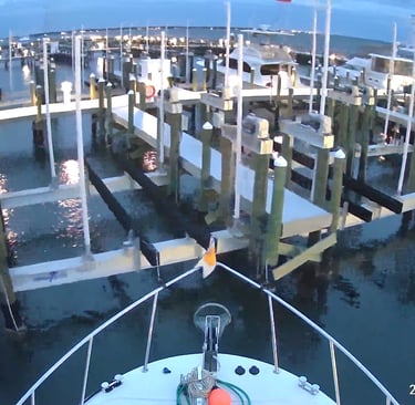 So, we took off heading east towards Florida. The nearest marina east of us that had transient moorage was 54 nautical miles away and we were leaving late due to returning the rental car and getting fuel at the Safe Harbor 25% discount. We left at 11:00 am. We are a slow boat, but can get up and go if we have to. We took the speed up to a little over 9 knots which is above the hull speed that the slow trawler type boat typically goes. The trip was uneventful except at the end. We had to cruise the last mile in the dark and pull into an unfamiliar marina. We called the marina in Fort Walton Beach and they said they saw us and would be on the dock to help us in. As we were trying to pull into the marina, we had 12 knot winds coming from the beam as we turned into our slip. Originally, we wanted to back in but the wind was overcoming our bow thruster. Then, the bow thruster quit. It was dicey with the wind blowing us down the fairway between docks of boats sideways. Finally, it blew us out of the fairway where we had enough maneuvering room to get use the engine and stern thruster to get us around. We had tripped the fuse to the bow thruster. Kevin went to the forward cabin while Bev was driving, reset the fuse, ran back to the helm and started down fairway again. Bev was busy resetting the fenders for a bow in tie with the dock on the starboard side. It was no longer twilight and the night was very dark due to the storm and low clouds. The picture below was taken with our night vision Wyze camera . Imagine coming into this marina in pitch black conditions with a dock hand on the dock holding a flashlight and high winds.